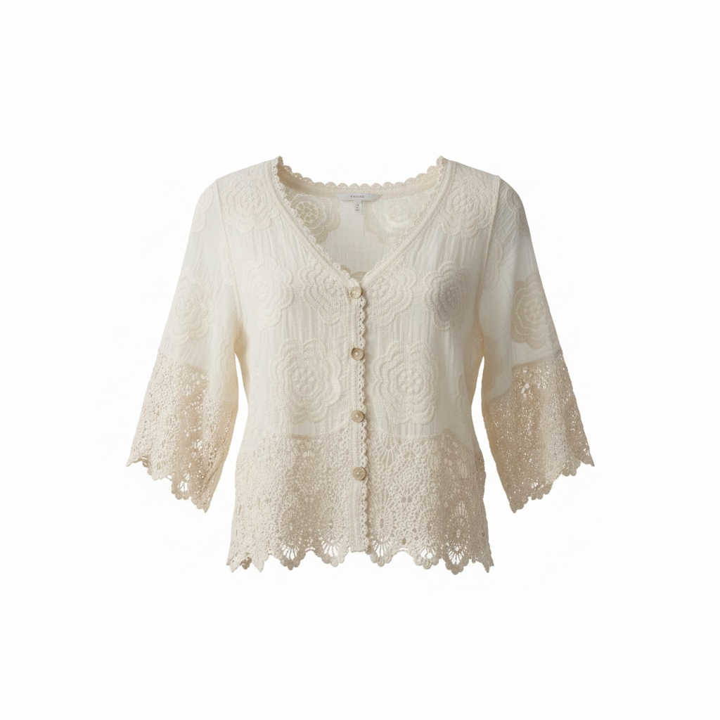 lightweight, bohemian-style lace cardigan featuring intricate floral embroidery and crochet detailing. It has a scalloped V-neckline, short sleeves, and a button-down front with delicate neutral-toned buttons. The hem and sleeves are finished with ornate crochet lace trim, giving it a soft, feminine look. Available in various colours.