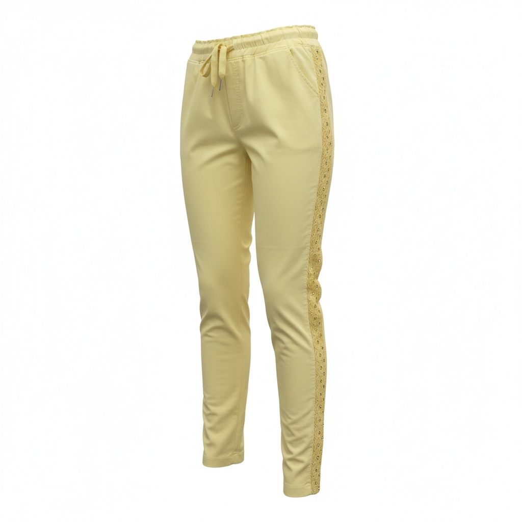 Light yellow slim-fit trousers with a soft stretch fabric, featuring an elasticated drawstring waistband and subtle lace trim detail along the sides. The trousers have a relaxed yet fitted silhouette with a slightly crinkled texture.