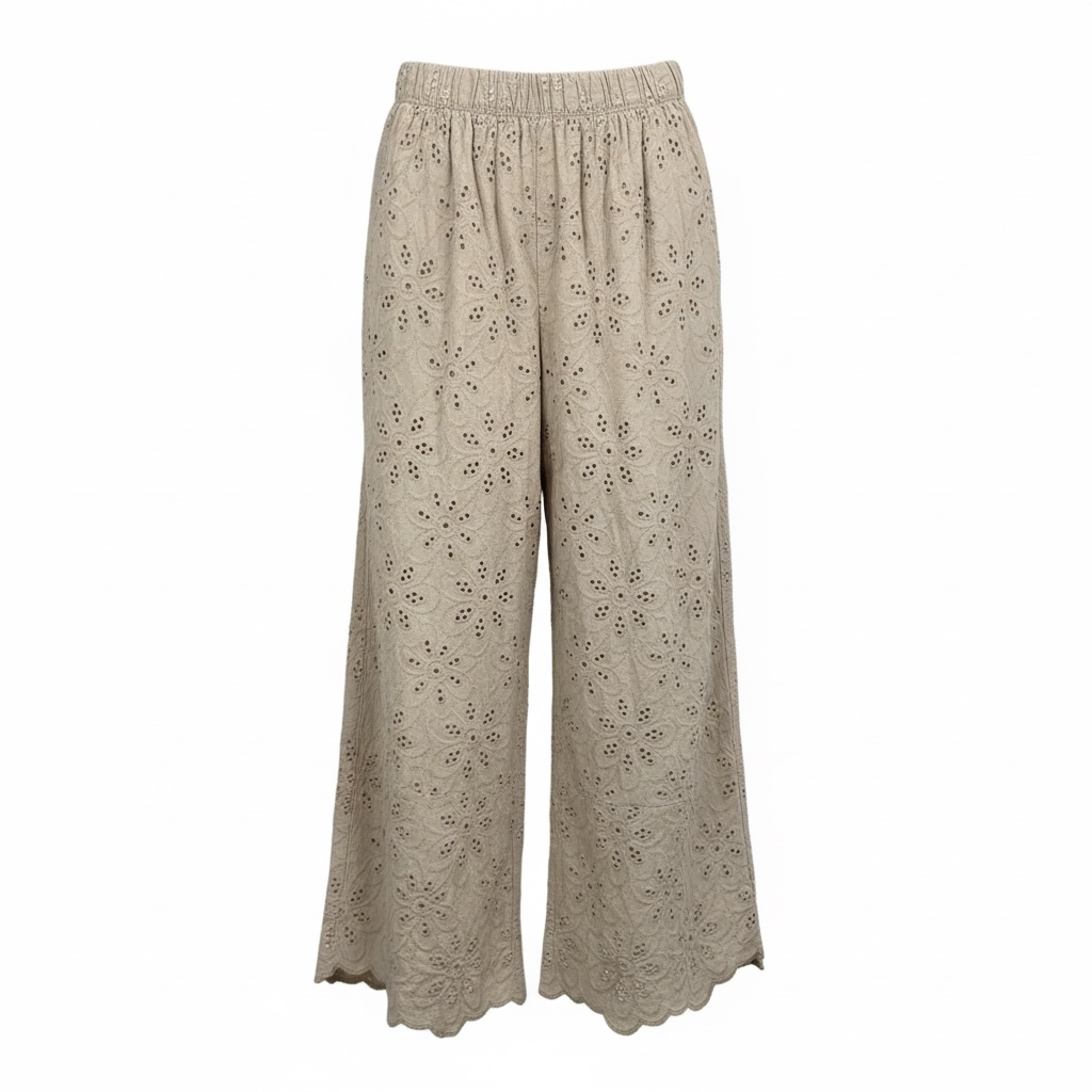 Lightweight, wide-leg trousers featuring an elasticated waistband for comfort and ease. Designed with an all-over broderie anglaise pattern and a softly scalloped hem, offering a relaxed, feminine silhouette ideal for warm-weather wear.